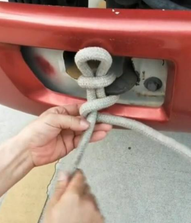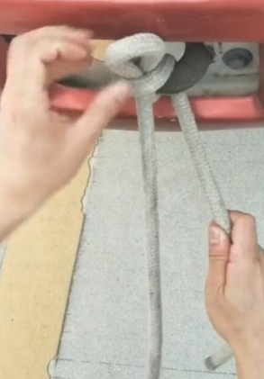 把底下右边的绳子从底下左边的绳子上转过去,然后把转过去的绳子再拉回来,将拉回来的绳子对折放到上面的绳圈中,拉进下面的绳子。