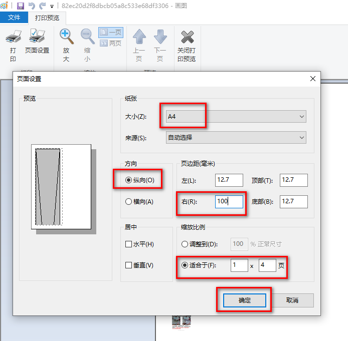 3、先 页面设置中 设置 打印A4 纸,纵向 ,分两栏就要把右边距设置为100,在适合于 设置 1 x 4,这里适合于根据左图缩略图看效果,然后确定,最关键是在打印时设置为只打印 奇数页