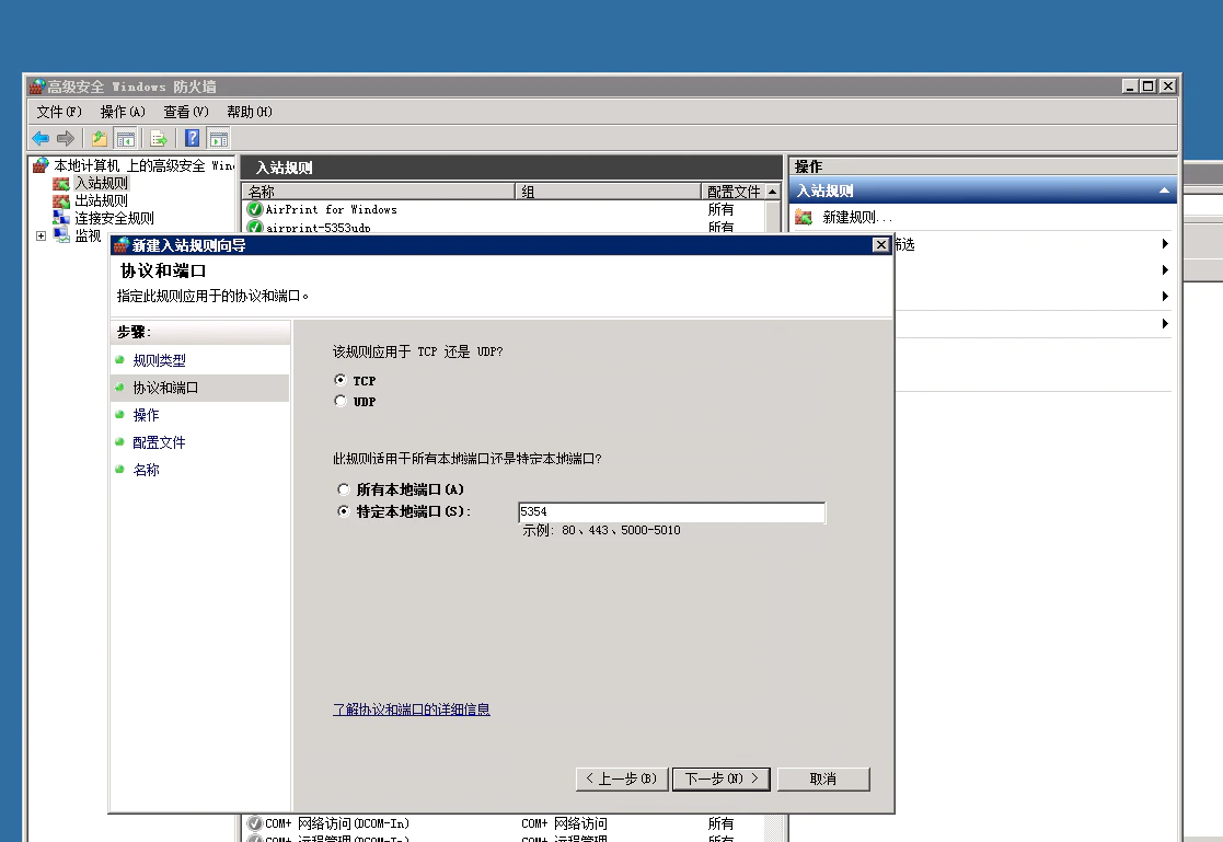在弹出的「新建规则向导」中,首先在「规则类型」中选择端口,然后在下一步的「协议和端口」中选择 TCP,在特定的本地端口中输入「5354」;在下一步的「操作」中勾选「允许连接」,然后后面全部默认点击下一步,最后设置一个特定的名称即可完成。