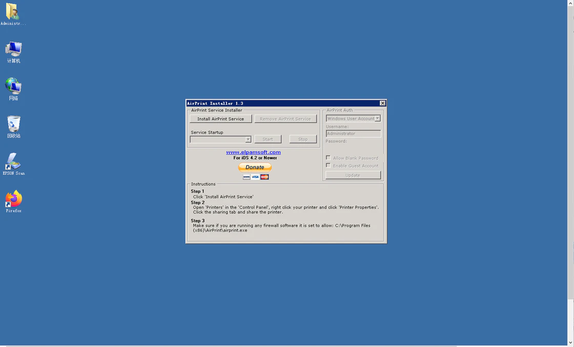 在主界面下点击 Install AirPrint Service 将无线打印服务安装进入系统服务项目中。