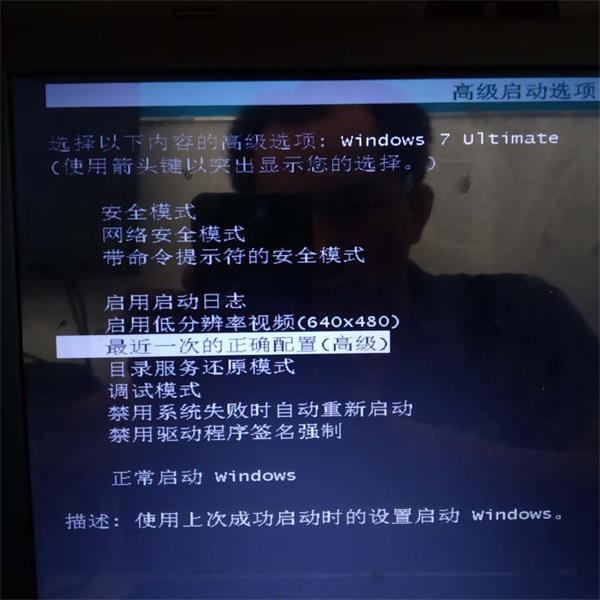 1、开机时不断按F8看到启动菜单选择“最近一次的正确配置(高级)”进入系统;